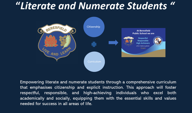 Our vision: Our aim is for every student, every teacher and every leader, to continue to improve every year. This will be achieved through the implementation of strategic plans in the teaching of literacy and numeracy and targeted professional development for teachers.